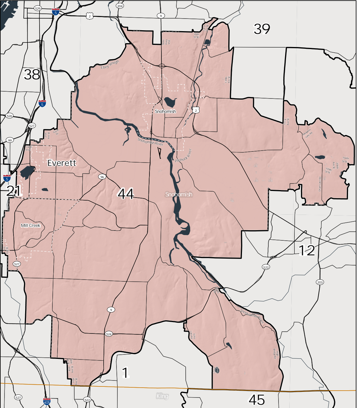 Washington’s 44th Legislative District is in Snohomish County and represents the people of unincorporated Bothell and Woodinville, and areas of Maltby, Clearview, Echo Lake, Mill Creek, Snohomish, Monroe, Lake Stevens, Everett, Marysville.